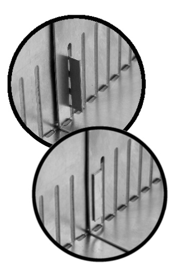 Zum Schließen und Fixieren des Kontrollschachts führen Sie die ca. 3 cm breite Lasche am Zuschnittende durch den ersten Schlitz der gegenüberliegenden Seite und legen sie um.