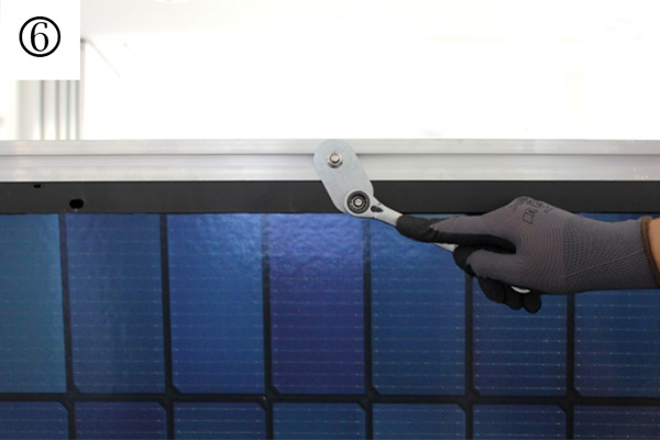 Einsetzen des bifacialen Moduls, Montage mittels 4 Modulverbindern und Befestigungsmaterial an den waagrechten Koppelungsprofilen.